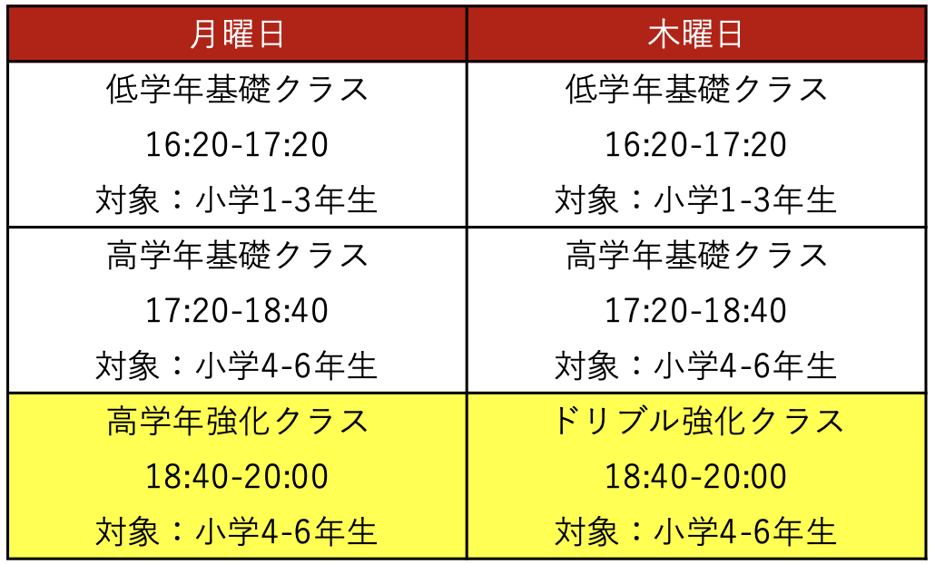 ※高学年強化クラスに所属の方の週2回コースは高学年強化クラス+木曜日高学年基礎クラスor木曜日ドリブル強化クラスになります。